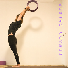 1. Upward Salute - inhale bring the wheel over head, ribcage lifted, slightly aching back, engaging core and shoulders lifted pushing wheel away from top of head.